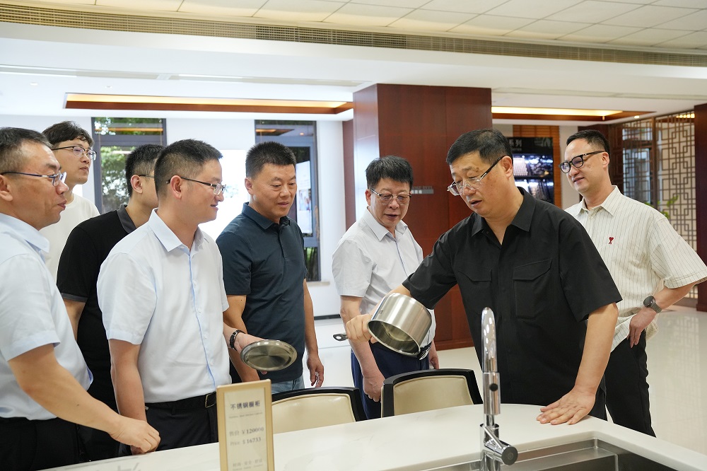 陈亦军一行首先在青拓集团供销大厅听取工作人员的详细介绍,了解企业发展历程、科技创新成果以及青拓集团在湾坞半岛的不锈钢产业链布局情况。随后,在陈庆科的陪同下,一行人员参观了不锈钢家具展厅。展厅内,各式不锈钢家具引人注目,这些家具不仅零甲醛、耐腐蚀,而且具备回收再利用的特性,充分体现了绿色低碳的发展理念。