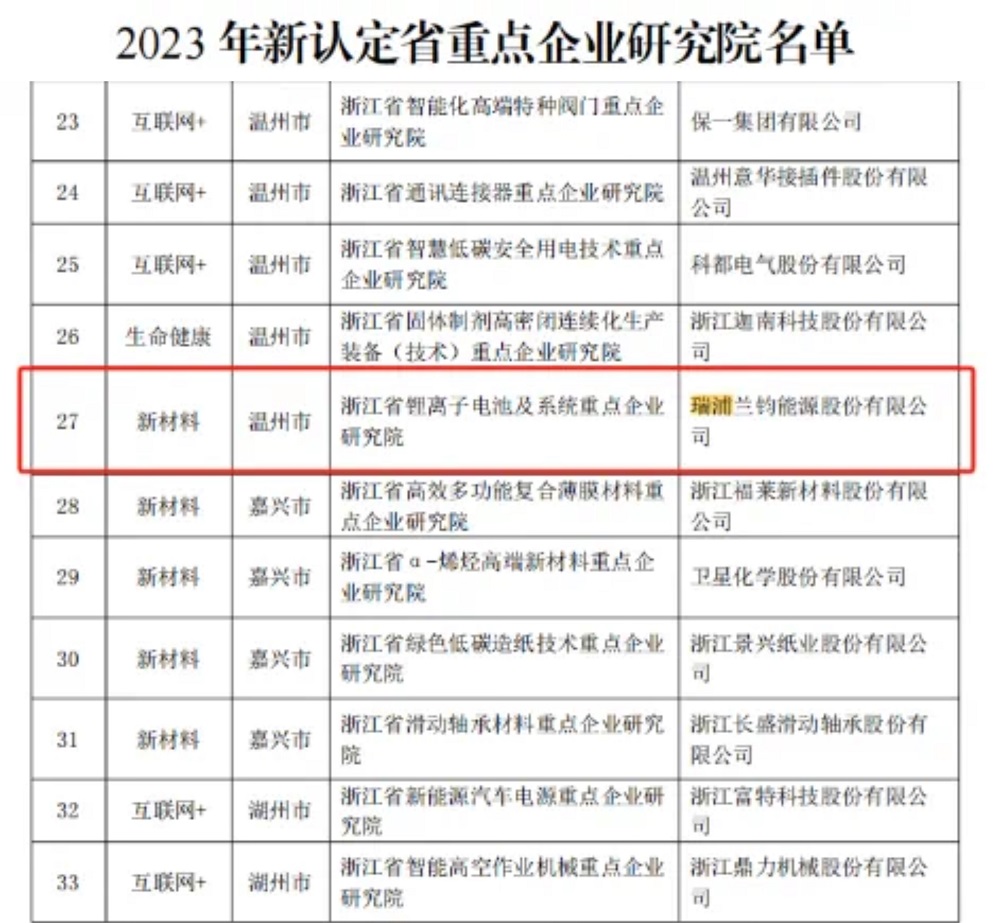 近日,浙江省科学技术厅公布了《2023年新认定省重点企业研究院名单》,其中瑞浦兰钧能源股份有限公司“浙江省锂离子电池及系统重点企业研究院”成功被认定为“2023年省重点企业研究院”。这是继2022年被成功认定省级企业研发机构之后,获得的更高荣誉。