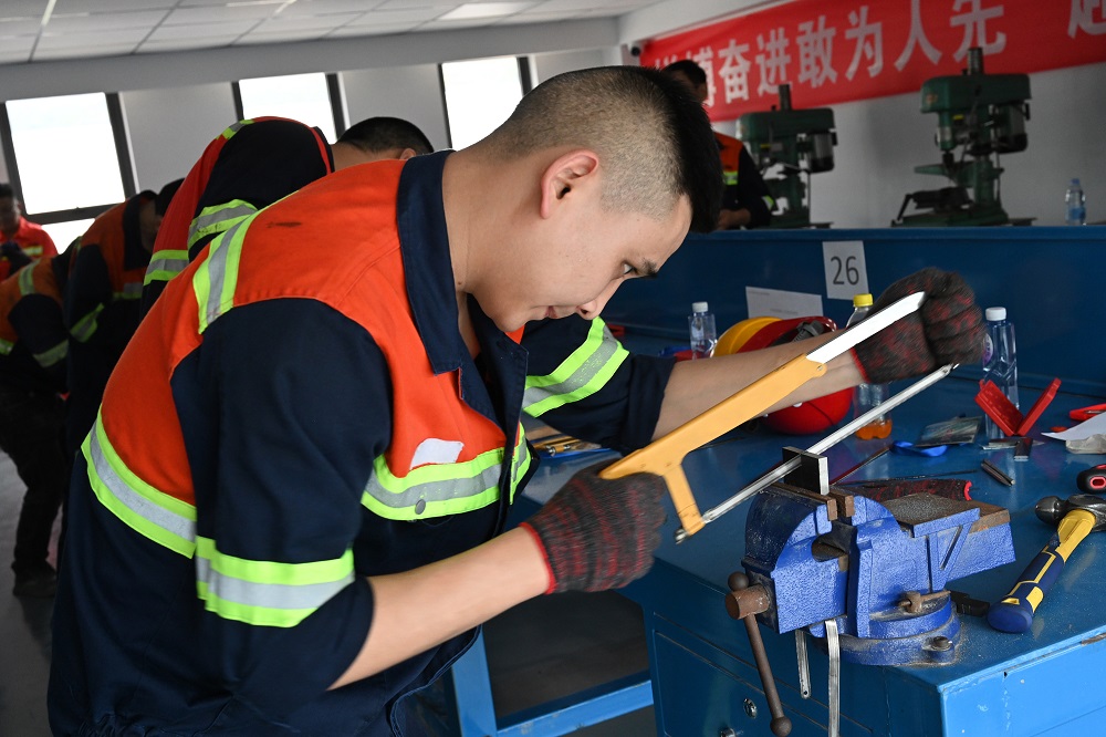 研究图纸、迈开弓字步,錾、锉、锯……一道道工序环环相扣,钳工项目的参赛选手们,一整套动作行云流水,他们聚精会神,操作严谨,力争展现出最好的自己。