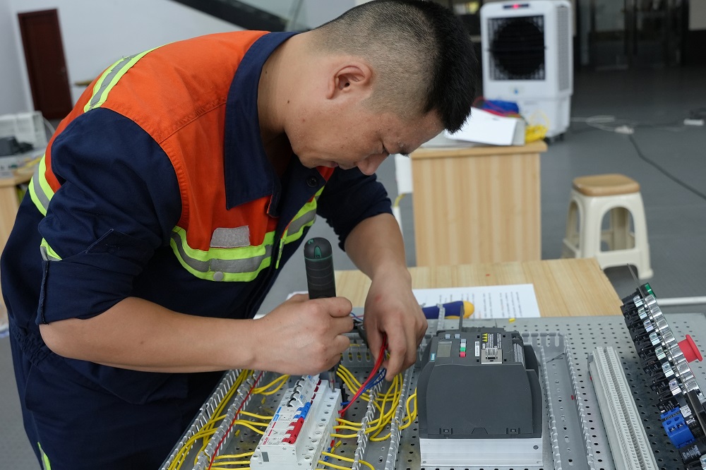 电工比赛现场,选手们争分夺秒地清点比赛用具、认真审题、画图、“穿针引线”,精细的零件在他们手中运用自如。